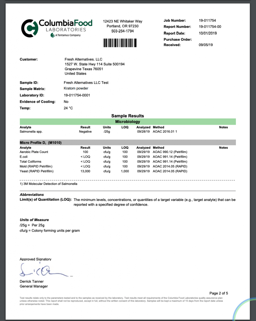 ]]>Please look at our latest LAB TEST! According to the lab, we are once again “much cleaner than most kratom they see”, and roughly 8 times cleaner than necessary according to AHPA (American Herbal Products Association) recommended microbial limits for botanical ingredients! The limits for COMBINED mold and yeast is 100,000, and as you can see, the FRESH ALTERNATIVES, LLC yeast is only at 13,000, and absolutely NO MOLD AT ALL! Ask any lab and discover that that level of sanitation is very rare, and we attribute that the our “SAFE-T-Scrub-brush” cleaning system, which you can see the video of here: https://www.youtube.com/watch?v=u1JJZtxrpj0