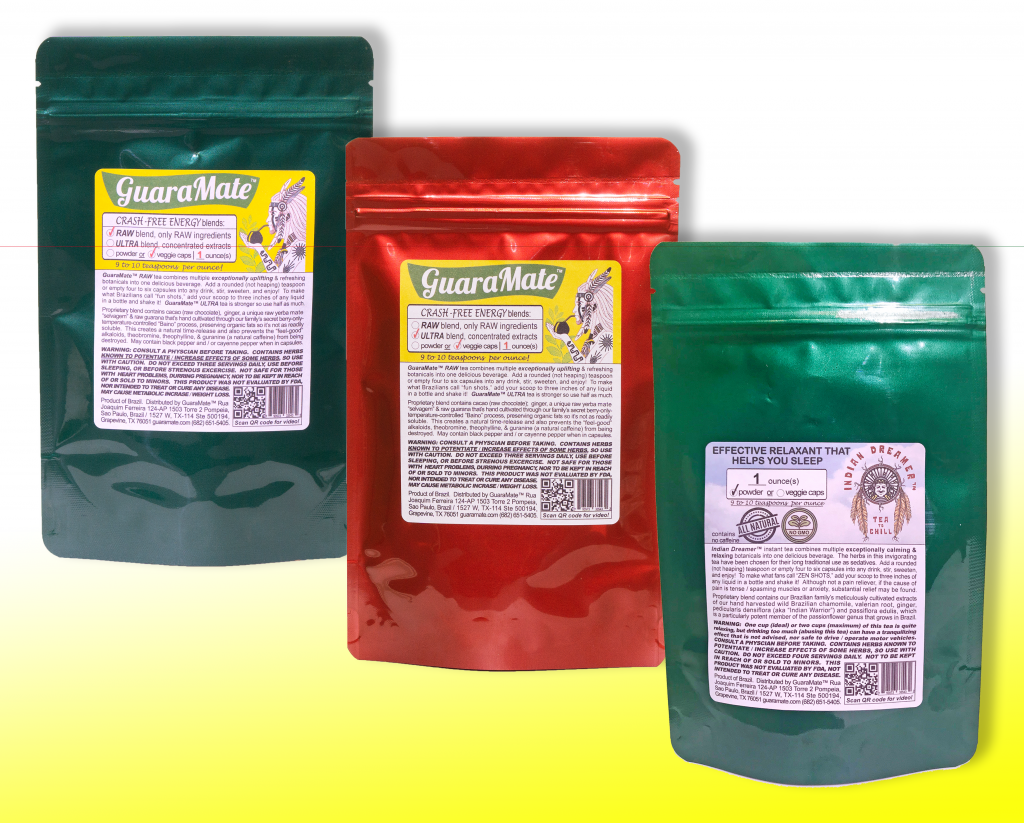 So now, those interested in trying Guaramate RAW® and/or GuaraMate ULTRA® (extract enhanced) and/or Indian Dreamer™ (chillax extracts blend) can choose the following: (mix and match is OK)